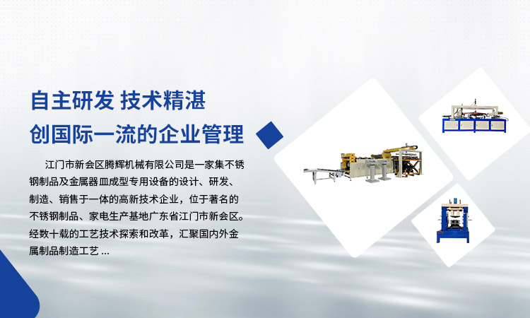 江門市新會區騰輝機械有限公司是一家集不銹鋼制品及金屬器皿成型專用設備的設計、研發(fā)、制造、銷售于一體的高新技術企業,位于著名的不銹鋼制品、家電生產基地廣東省江門市新會區。經數十載的工藝技術探索和改革,匯聚國內外金屬制品制造工藝。